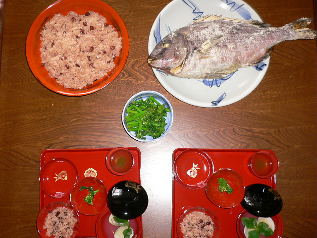 2006-03-26 (Sun) お食い初め ここのところ寝不足気味だったので、午前中は甥っ子たちを代わる代わる僕のベッドに寝かせながら添い寝。朝8:00amに一度起きて朝ごはんを食べた後は、お昼近くまでずっと彼らと寝ていました。 そして起きてみると、赤飯だの鯛の尾頭付きだのが用意されていましたよ。 赤ん坊が生まれて100日目に、一生食べ物に困らないように、と祈る“お食い初め”という行事をするのだそうで。僕はもちろんカメラマンです。当然まだミルクしか飲めないから、食べる真似をさせるだけね。