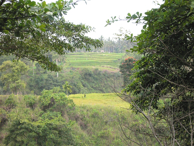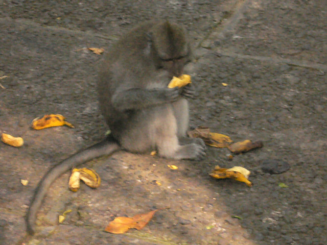午後はバスでウブドという少し山沿いの観光地へ行きました。旅行会社のオプショナル・ツアーらしく、まずは提携している雑貨屋と銀細工屋に連れて行かれ、いくらか買い物をさせられた後、モンキー・フォレストという猿が放し飼いにされている公園に到着。高尾山のサル園みたいなもんだろうか。