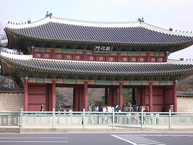 その後、銀行に両替に行こうとしたんだけど、土曜日はお休み。仕方なく引き返して、キョンボックン(景福宮)という李氏朝鮮時代の王宮を見学しに行った。1日数回、各国語のガイドさんに付いて回るシステムになっているのだそうで、10:30amから日本語ガイドの回。チョロッと見る程度の簡単なものかと思ったら、とんでもない。何と1時間20分のコース。昨夜あまり寝ていないので、眠いわ歩かされるわでもうヘトヘト。朝鮮の歴史をいっぱい説明してくれたのに、ひとつも頭に入らず、ただ疲れた。