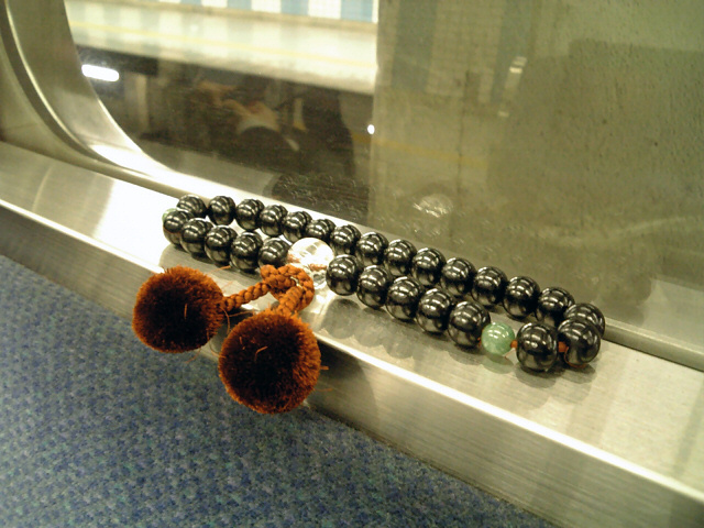 帰りの電車でなぜか・・・お数珠!? 忘れ物にするなんて不謹慎ですね。バチが当たりますよ、まったく。何となく携帯で撮ってみたり。高価な物だったら貰っちゃえば良かったかな?