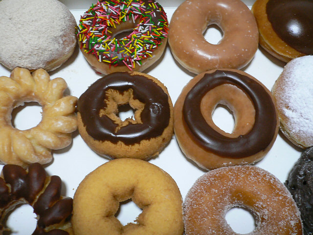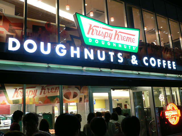 そしたら、8:00pm過ぎだというのに、店の前には行列が・・・。すげえ。50分待ちとか書いてあるし、見ただけで挫けそうだったけど、ここは一つどれくらい待たされたのかも話のネタにするかと思い、最後尾に付いた。8:09pm。女性が圧倒的に多かったけど、僕のようなサラリーマンスタイルの男性もちらほら。近くでは「昨日も並んだんだけど、途中で諦めたの」なんて会話が聞こえてくる。「そんなに待たされるのか」とビビりながらも、予想よりは良いペースで前に進んでいく。5分が経過した頃、店のおねえさんが出てきて、何やらドーナツを配っている。「試しにお召し上がりください」と言って、丸々1個渡された。「え? 食っていいの?」大サービスじゃんね。