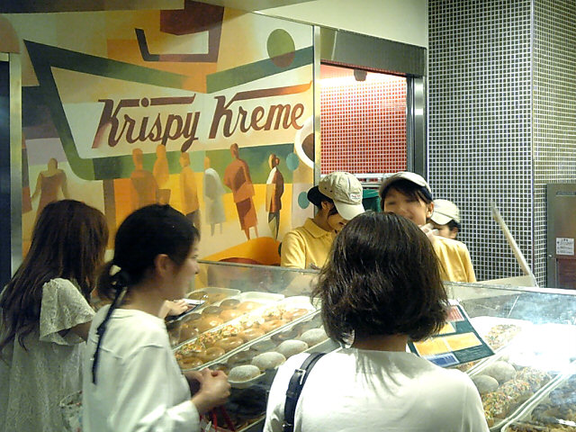 そこで思い出したのが、最近マスコミにやたら取り上げられているドーナツ屋。南口のサザンテラスにある“クリスピー・クリーム・ドーナツ”ってお店で、毎日長蛇の列ができるほど人気なのだとか。ちょっと話のネタに覗いてみて、あわよくば(空いてたら)買ってみようかなと思って行ってみた。