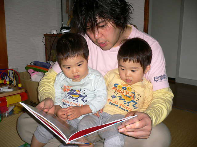 でも起きている間は、容赦はされません。おじいちゃんが買ってきた絵本があるんですが、少々字が多くて、彼らにはまだ難しい。しかしなぜかその本の1ページ目を、僕に読んで欲しいとねだるんです。仕方がないので読んであげる。そして2ページ目を開くと、すぐまた1ページ目に無理矢理戻して、最初から読んで欲しいと言う。ひたすら1ページ目を20回は読まされたでしょうかね。