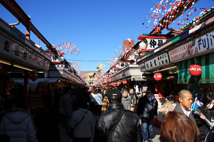 仲見世通りを歩いてみる。ものすごい人混み。甥っ子たちがうっかり迷子になってしまいそうでした。やはり外国人が多く、土産物を珍しげに眺めています。