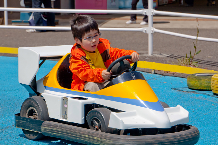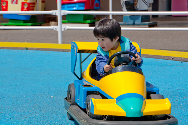 到着早々ゴーカートに乗せたんです。一応対象年齢は4歳からとなっていたんですが、ハンドルとかアクセルとか理解できるか心配だったんです。そんなの大いなる杞憂でした。「赤いボタンを踏むんだよ」と教えてあげたら、瞬く間に理解して、ハンドル操作も完璧。少し前から自転車に乗せてたのが良かったのかな。