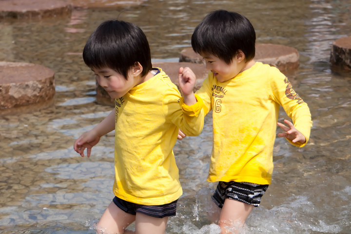 まだちょっと肌寒かったのだけれど、意にも介さずズボンを脱ぎ捨て、水の中に入っていきました。初めのうちは濡れないように気を遣っていたものの、結局は転んだりしてビショビショになり、「冷たーい」と叫びながらも、最終的にはタンクトップ姿ではしゃぎまくり。