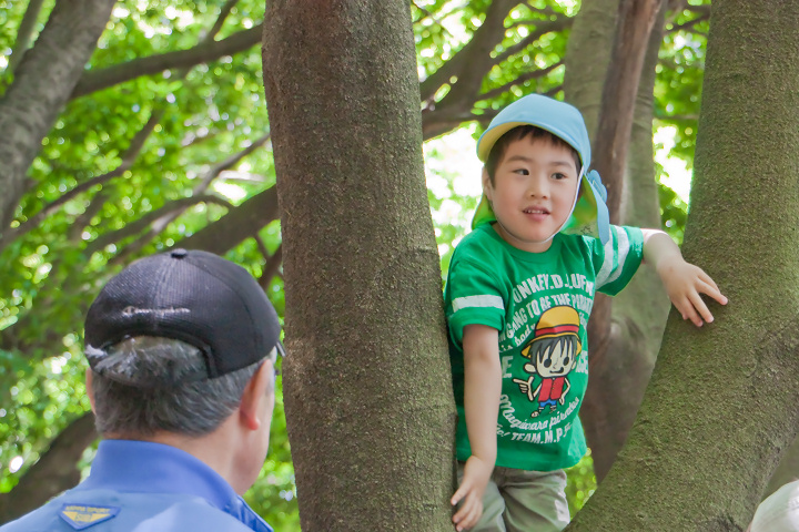 そんなこととはを知らずに、たまたま午前中のうちに実家に行くと、ちょうど園児たちを発見! 跡を追うことにしました。小高くなった森を入っていくと、甥っ子たちが何か歌を歌っているところでした。YutaもKotaもすぐに僕に気がついてくれて「あ、おじちゃんだ」と、若干不思議そうな顔で手を振ってくれましたよ。
