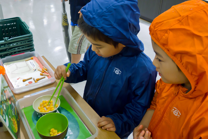 バラエティグッズのコーナーに、その名も「マナー豆(ビーンズ)」という“箸の持ち方”を練習するための玩具があったのですが、ふとKotaがプラスチックの豆を箸で掴んで、別の容器に移し替え始めたんですよ。何の説明もしていないのに、正しい遊び方を悟るのがすごいと思ったのですが、さらには全部で28個あった豆を、全部移し替えていました。次にYutaも挑戦して、やはりやり遂げていましたよ。