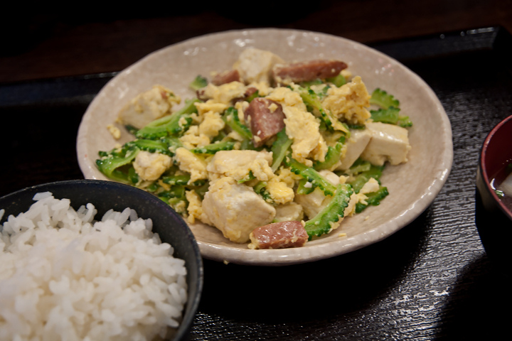 堕落した食生活の免罪符としていただくゴーヤーチャンプルー。ニガウリに豆腐に卵ですから夏のスタミナ食としては栄養バランスは最高だと思いますが、お店で出てくるやつは結構カロリー高いですよね? ラードを使ったりするし、ポーク缶なら脂も多いし。それに味も濃いめ。
