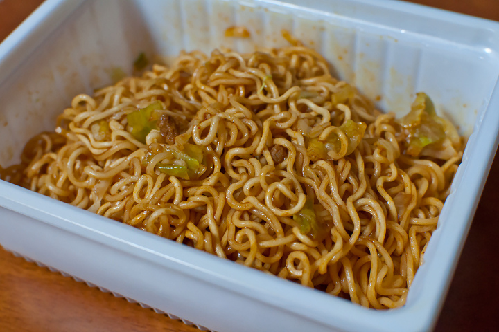 中身は至って普通のペヤング。ソースとかやく。こういう激辛ものって、辛味パウダーみたいなのが別に付いていて、お好みで調節できたりするのかと思ったら、そういうのはなくて、どうやらソースそのものが辛いようです。出来上がりの見た目も至って普通のペヤング
