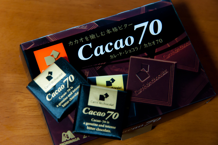 そんなことを1ヶ月前くらいに思い出し、久しぶりに高カカオ・チョコレートを食べてみたいなと、コンビニなどをずっと探していたのですが、今日、やっとカカオ70%の製品をスーパーで見つけましたよ。