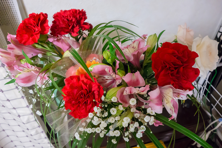 花屋の前には「今日売らなければ、いつ売るのか!」と言わんばかりに、カーネーションをメインにした色とりどりの花束が陳列されていました。