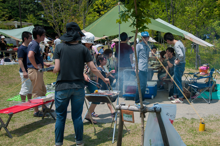 そしたら、すっかり会場の準備は万端でした。毎度苦労するタープもすでに張られ、あとは肉を焼くだけと言わんばかり。