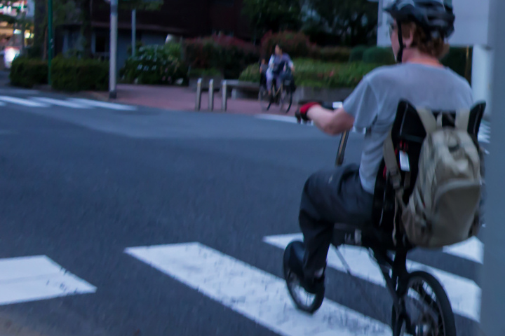 帰りは向かい風が強く吹いていたのでタラタラと漕いでいたのですが、僕の横を不意に“足”がニョキッと現れました。「え? 足!?」と思ったら、後傾になって漕ぐハーレー・ダビッドソンのバイクみたいな自転車って見たことあります? アレだったの。