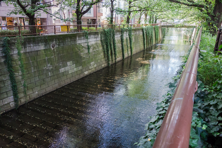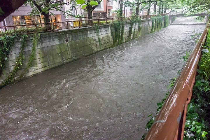 それにしても、さっきまで川底が見えるほどそよそよ流れていた目黒川が、ものの数十分で急変するもんなんですね。濁流。