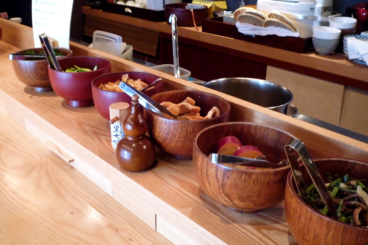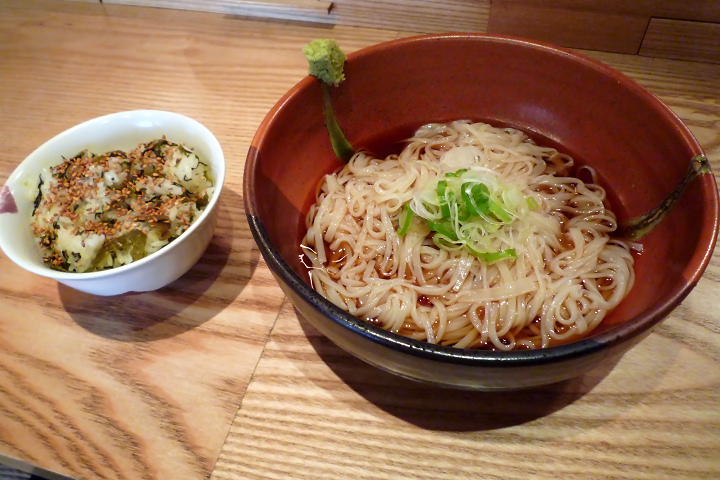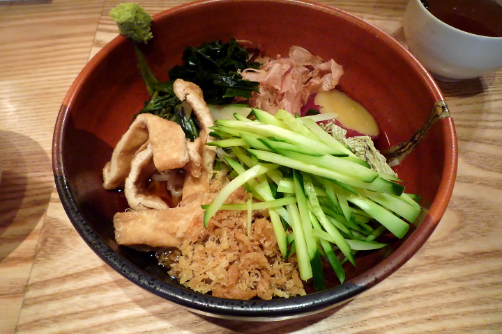 メニューはもちろん稲庭うどんしかなく、温かいのか冷たいのかを選べて、さらに“もりうどん”か“ぶっかけ風”かを選べます。8種類ほどあるトッピング(とろろ昆布、山菜、サツマイモ、揚玉 etc...)を自由に盛り付ければ、結構なボリューム。