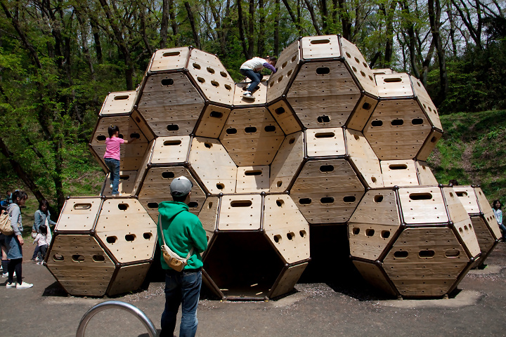彼らのお目当ては毎度おなじみ“キャトルズ”です。今までは14面体ブロックの内側を「VS嵐」のジャングル・ビンゴごっこをして遊んでいたのですが、今日はついに外側を登るのに挑戦。「VS嵐」のクリフ・クライムごっこに格上げしました。