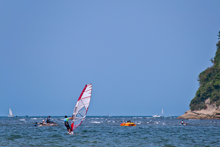 さっそく砂浜でテントを広げようとしたのですが、海風が強くて悪戦苦闘。ようやく少し形が見えてきた頃、どこぞのおにいちゃんが近づいてきて「テントは禁止なんで、海の家でパラソルを借りてください」と言われました。逗子海岸の組合の決め事のようで、素直に従いましたけど、もう少し早く言ってよぉ! そんなこと知らないものぉ! どこにもそんなこと書いてないし! 10分くらい悪戦苦闘したじゃんか!