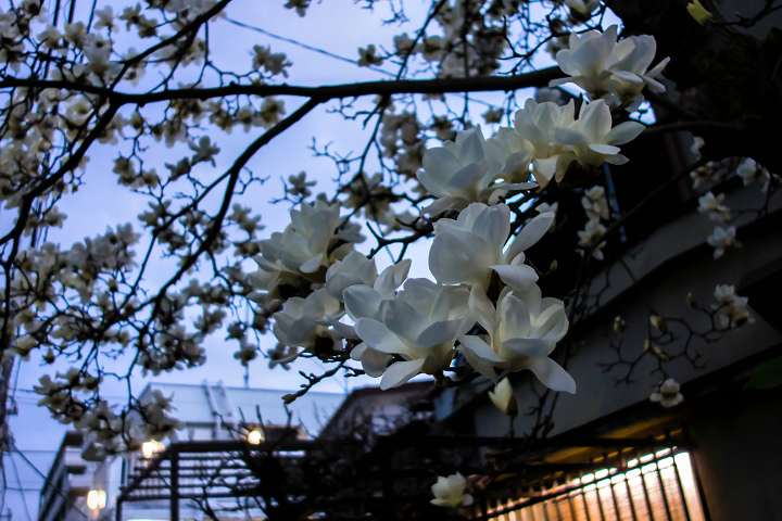 自転車に二人乗りしている親子が、僕を追い越し際に「ほら、ハクモクレンだよ。きれいだね」と話していて、ハッと見上げたら大ぶりの花がワッと目に飛び込んできたんですよ。