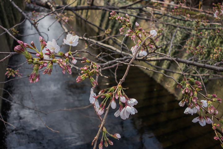 つい先週見た時は、まだまだ蕾が堅そうだったので、「そんなぁ、まさかぁ」と思いながら出勤したら、目黒川沿いのサクラもたしかに咲いていました。