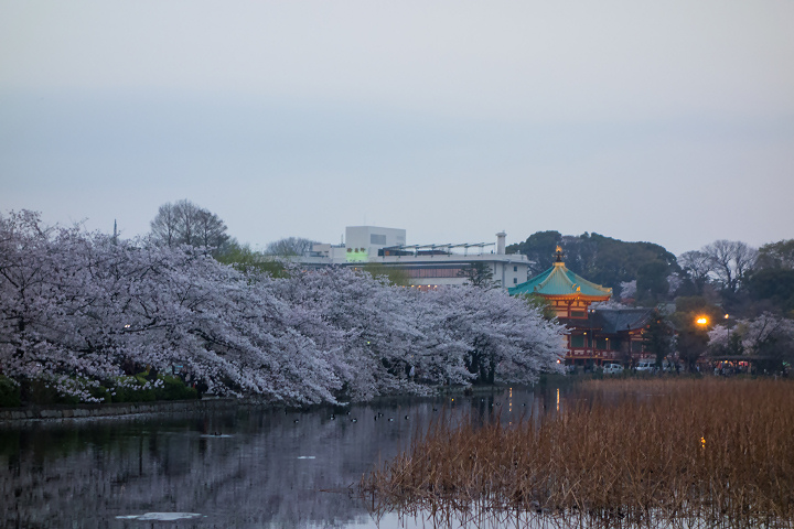終業の鐘とともにダッシュで職場を出て、湯島に着いたのが6:00pm。ギリギリ日が暮れる前で、弁天堂のライティングも良い具合に演出していましたよ。
